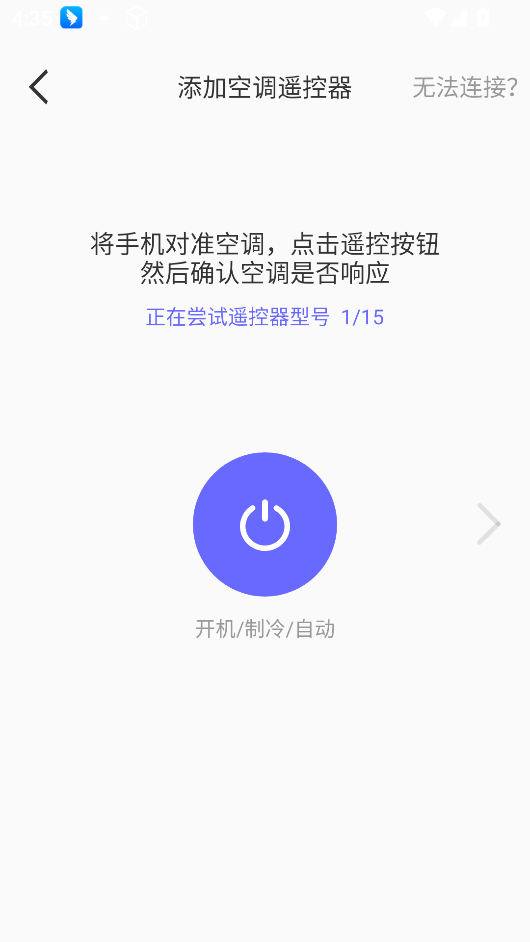 出现匹配界面,依照说明逐个匹配按钮:将手机对准空调按下开关图标,如果空调无响应,点击否,切换至下一组匹配按钮,重复以上匹配过程;如果空调正确响应,点击是,全部按钮正确响应后点击“添加此遥控器”,软件切换成遥控面板,空调遥控器添加成功。