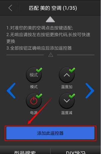 打开添加遥控器,依次点选家电型号、品牌,再对遥控按键逐个匹配,成功后即可添加此款家电的遥控器,下面以美的空调为例进行说明。
