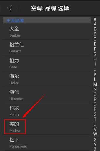 打开添加遥控器,选择家电类型:空调;空调品牌:美的;