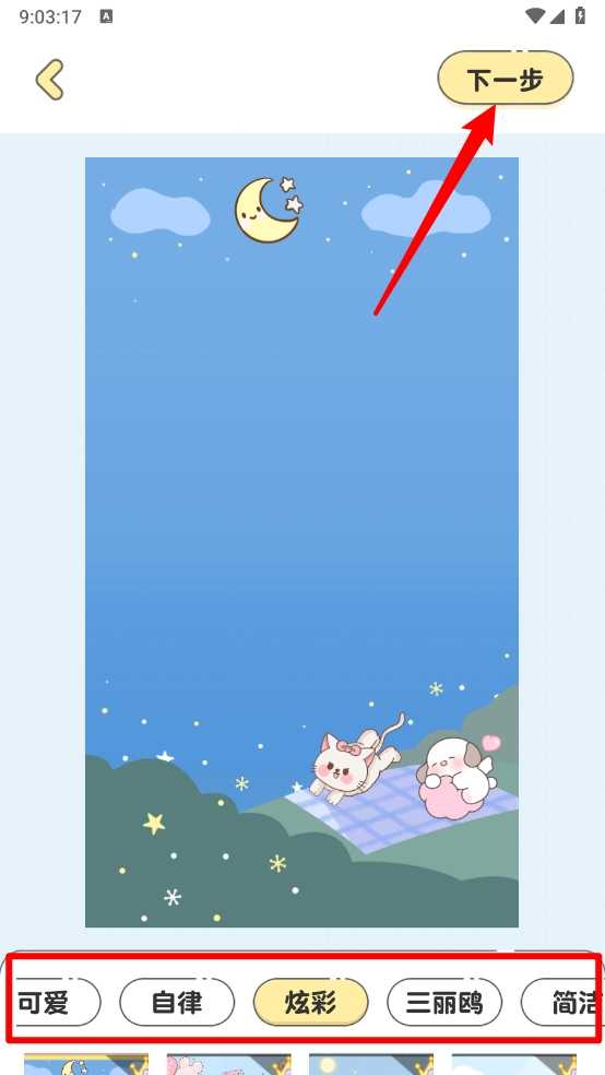 3、在制作页面选择喜欢的类型,完成后点击右上角"下一步"。