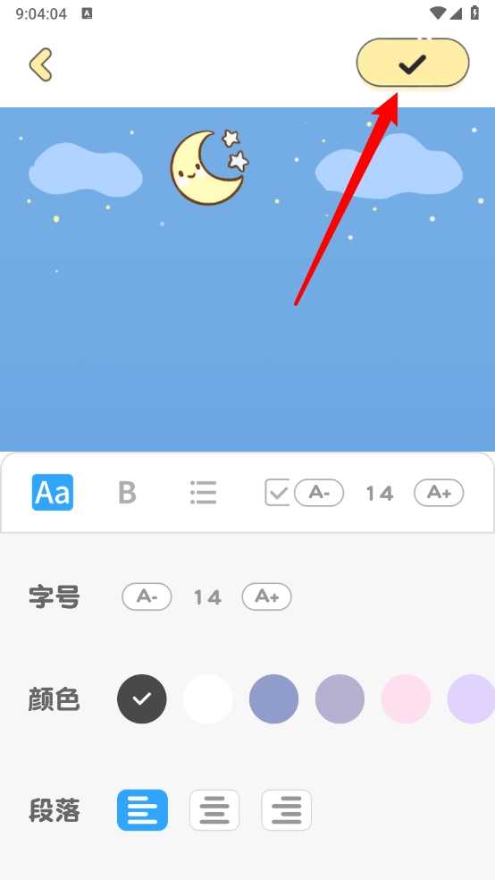 4、在新的页面选择字号、颜色、段落后,点击右上角对钩图标。