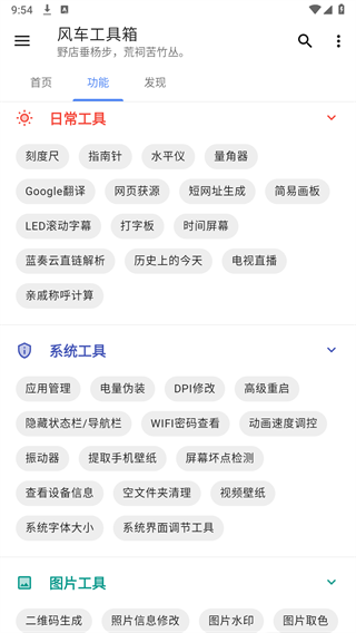 风车工具箱这一款极具特色的手机工具箱软件,为用户们提供了丰富的工具,操作方便快捷,一键轻松下载使用,适用多种场景,无论是生活还是工作,都能够提供很好的使用体验,如日常、图片、查询、游戏、计算等,并且软件的界面简洁、操作简单,新手用户经过简单了解就能快速上手使用,是款非常棒的手机工具箱软件,有需要的朋友们赶快来下载吧。
