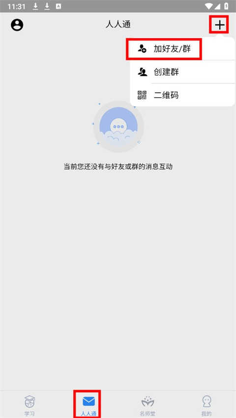 1、在人人通页面,点击右上角的“+”号,然后点击加好友/群。