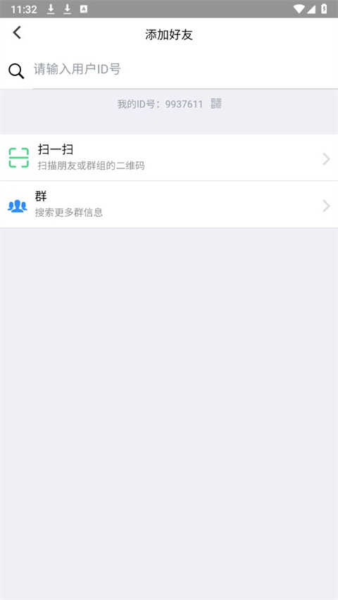 2、可以输入用户ID,或扫描朋友/群组的二维码进行添加好友。