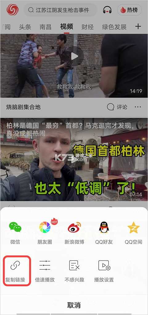 2、在弹出的选项中,寻找并点击“复制链接”功能,以便获取该视频的在线地址。