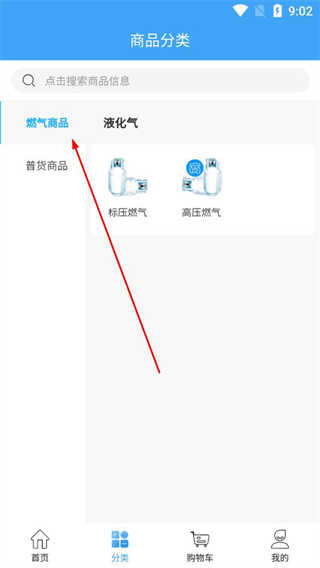4、进入商品分类页面选择燃气商品分类,查看标压燃气、高压燃气等选项,可根据需求选择对应的燃气商品类型。