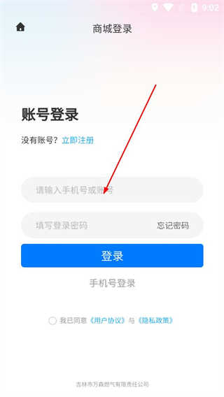 2、在商城登录页面,选择账号登录方式,输入手机号或账号、登录密码,勾选相关协议后点击登录按钮,完成账号登录。