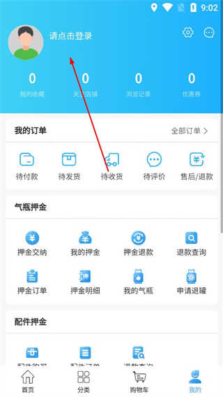 1、进入万森燃气我的页面,查看我的订单及气瓶押金等功能模块,点击左上角请点击登录入口,进入登录流程。