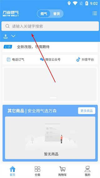 3、切换到首页查看全新改版的提示内容,点击顶部搜索框,可输入关键词搜索燃气相关的商品或服务信息。