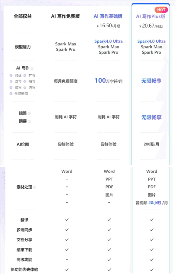 基础的写作功能、文档处理功能都是免费的,只有部分高级功能是需要开会员的,下图是讯飞写作app付费权益表