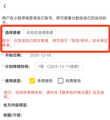3、将运动处方预览区的内容发送给用户,可发送给已绑定的小程序用户。点击之后会跳转到【选择患者】页面,指定一个已绑定的患者进行发送处方,点击【发送患者】。