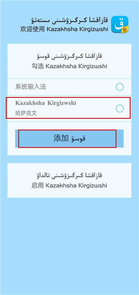 1、打开这款软件之后,我们选择哈萨克文,然后点击添加按钮。