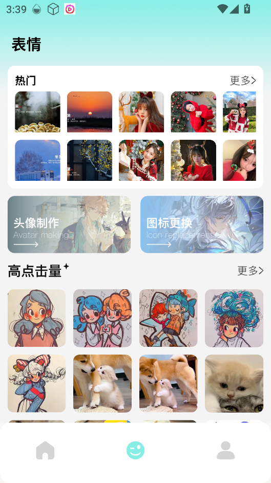 3、表情页面可以使用表情包、头像,还能进行头像制作和图标更换。
