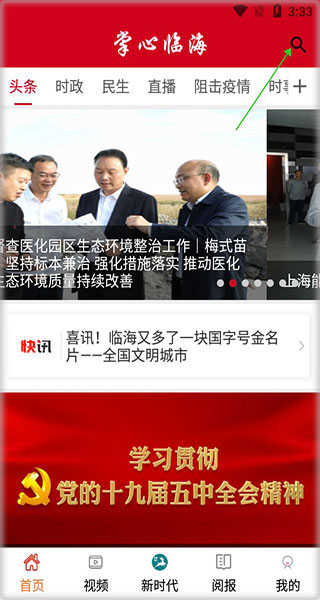 1、下载安装app,打开软件进入首界面,这里用户可以在箭头指向位置搜索自己想要看的新闻;