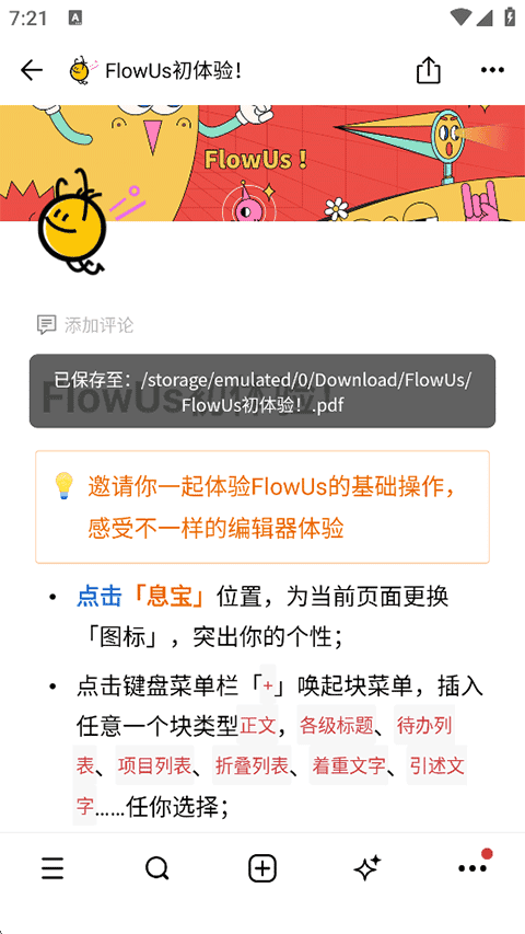FlowUs息流官网版是一款集文档协作、多媒体笔记、文件共享于一体的创新型生产力工具,支持跨平台同步,助力个人与团队高效管理信息与知识,软件以“自由流动”为核心理念,打破传统笔记应用的单一形式,支持文本、图片、视频、表格等多元内容混合编排,打造沉浸式创作体验,让信息管理更轻松、分享更便捷。