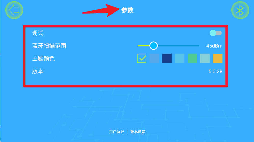 5、在“参数”设置中,用户可调整蓝牙扫描范围、主题颜色、版本信息等,满足个性化和设备调试需求。