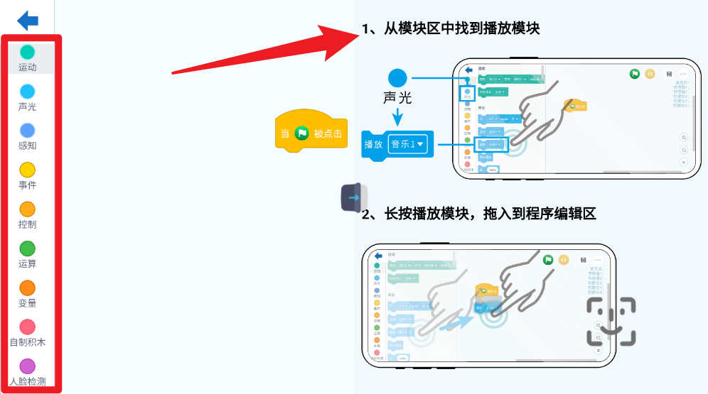 4、在编程界面,左侧提供运动、声光、感知、事件、控制、运算、变量等功能模块,用户可拖拽相应模块至编辑区,组合实现机器人动作与功能。
