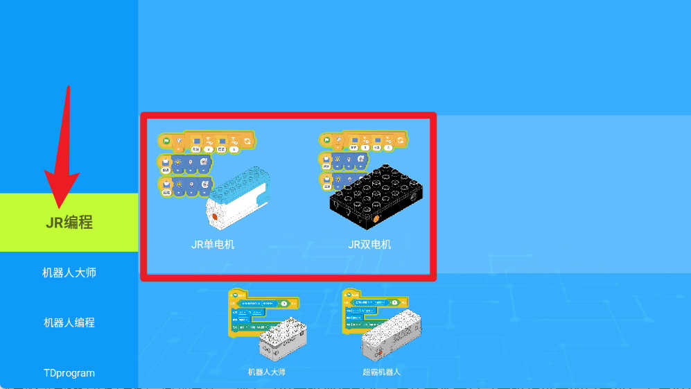 2、在“JR编程”页面,可选择不同模块,如JR单电机、JR双电机,进入后即可进行相关编程操作。
