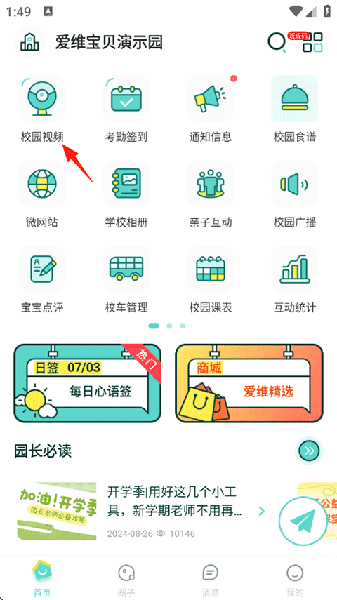 1、打开爱维宝贝园长端APP在首页点击校园视频;