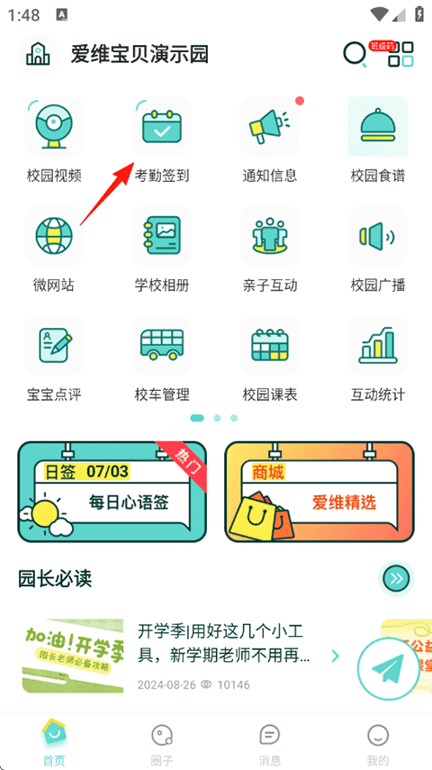 1、打开爱维宝贝园长版APP,在首页点击考勤签到;