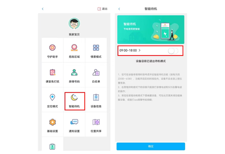 1. 智能待机设置:精准控电,关键时刻不掉链智能待机功能进一步优化了电子学生证的电量管理,减少不必要的电量消耗,延长电子学生证的使用时间。点击"智能待机"选项,即可自主配置设备休眠时段。待机模式启用后,仅可进行亲情通话,不可对设备进行功能设置及定位。