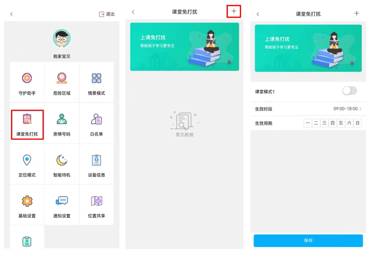 2)【课堂免打扰】:"课堂免打扰"功能可以设置课堂模式,在设定时间段内自动禁用通讯功能(包括SOS号码+亲情号码),确保在上课期间学生证设备处于不影响教学的状态。