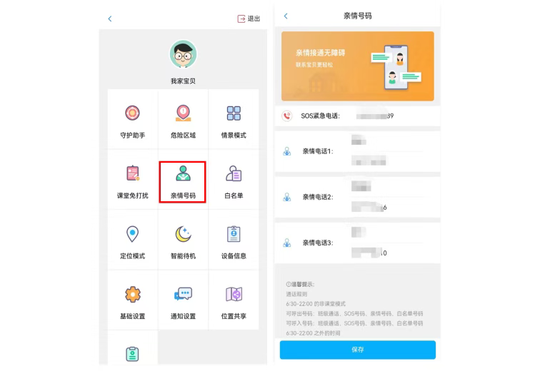 【亲情号码】(3 个):可设置为家长或接送人号码,既满足了日常沟通的便利性,更为孩子在校安全提供了即时联络保障。