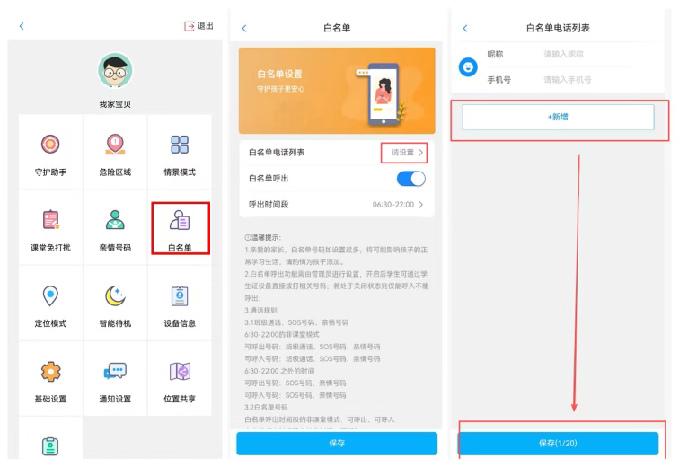 点击 “添加号码”,最多设置 10个(建议添加家人、朋友、班主任的号码);