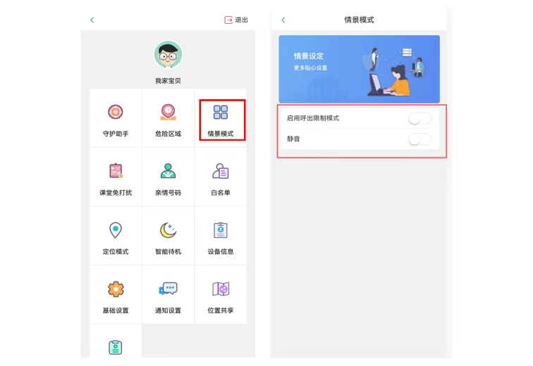 1) 【情景模式】:情景模式功能支持场景化通信管控配置,家长通过点击"情景模式"选项可激活唿出限制模式与静音模式双通道管理。