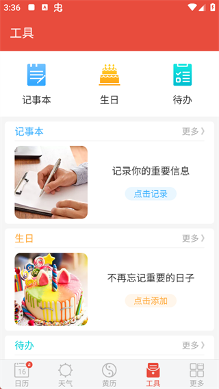 优化黄历界面功能,增加代办功能,增加生日提醒功能,优化记事本