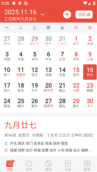 拥有完整的老黄历信息,详细罗列出农历节气变化,每日宜忌,吉神凶神,天干五行,同时显示公历、农历和干支历等多套历法