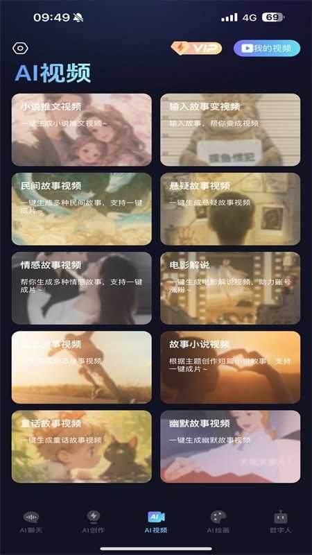 4、在AI视频页面,提供了小说推文视频、电影解说等创作功能