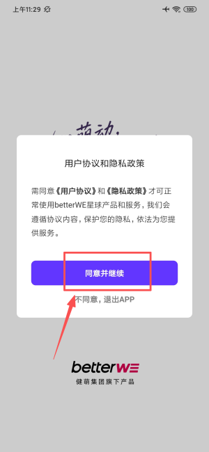 1、在用户协议和隐私政策提示中点击"同意并继续",即可进入应用。