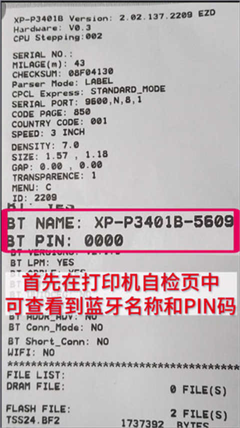 1、首先是要在打印机自检页中查看蓝牙名称和PIN码。
