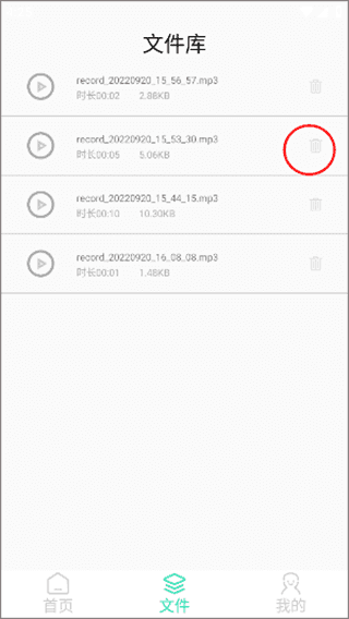 2、进入文件页面,点击要删除的录音文件后面的“删除”按钮