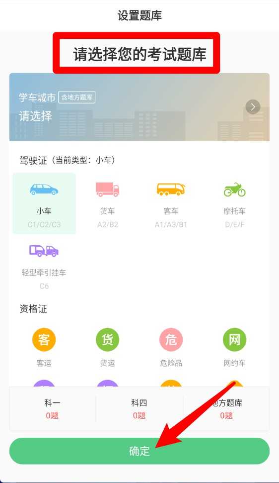 1、首次进入系统请选择考试题库,可根据驾照类型与考试类别进行详细分类设置。