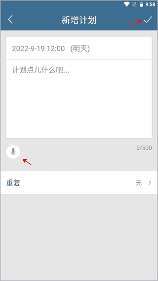 2、手动或语音输入的方式写点未来的计划,根据自身的需要来是否重复这个计划,点击右上角的“√”新增成功。