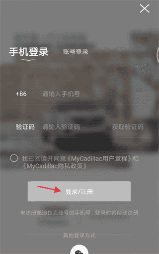 2、进入MycadillacAPP,选择相应的登录方式进行登录;