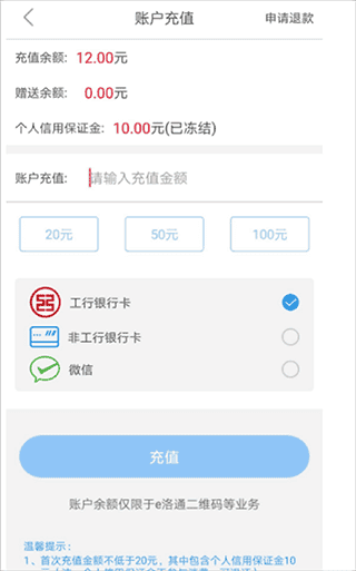 点击首页“充值”,可支持工行卡、非工行卡、微信进行充值。首次充值需≥20,含10元个人信用保证金(可退、不可消费)和10元余额。非首次充值不限金额。