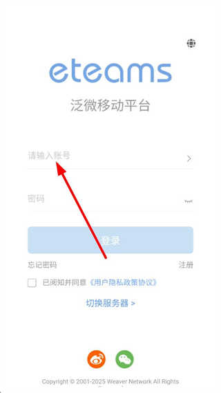 1、进入平台登录页,可选择账号密码登录方式,需先输入账号和密码,勾选用户隐私政策协议后点击登录,也可通过微信等第三方账号快捷登录。