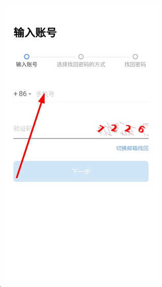 2、若需找回密码,进入输入账号环节,选择手机号找回方式,填写对应手机号及验证码,完成验证后即可进入后续密码找回流程。