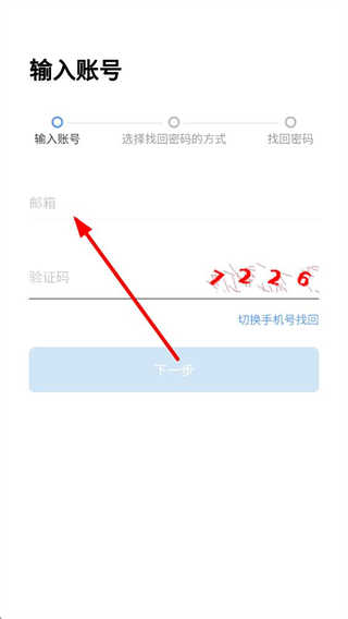 3、也可切换为邮箱找回密码,对应输入框填写邮箱地址及验证码,验证通过后即可继续操作,适配不同账号绑定的信息类型。