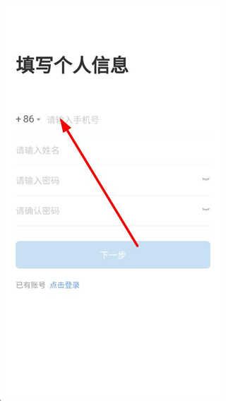 4、注册账号时进入填写个人信息页,依次输入手机号姓名密码及确认密码,完成信息填写后点击下一步,即可推进注册流程。