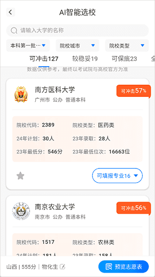4、选择好院校和专业后即可点击右下角的【预览志愿表】
