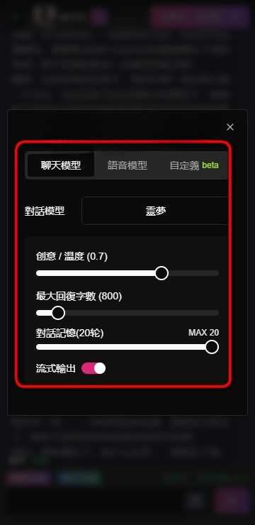 2、接着会弹出一个界面,可以根据需求,设置最大回复字数,对话记忆以及聊天模型。