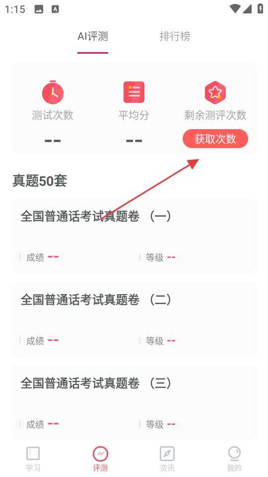 3、展示测试次数等数据,设获取次数按钮,有50套真题卷,方便用户模拟考试、检测普通话水平。