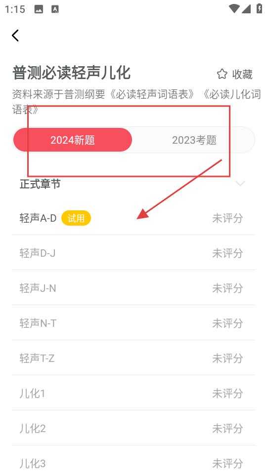 2、分2024新题、2023考题,列轻声A-D等章节,可进行专项朗读练习,提升轻声儿化发音水平。