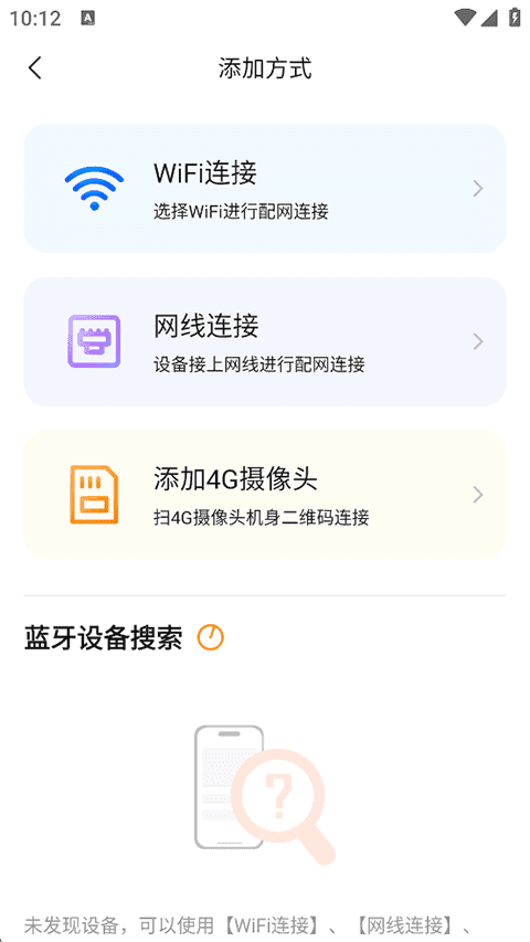 2、平台提供了WiFi连接、网线连接、添加4G摄像头以及蓝牙设备搜索4种连接方式;