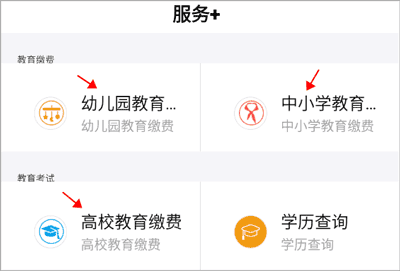 1、打开软件后,在“服务+”界面,选择缴费类型,幼儿园、中小学、高校教育。