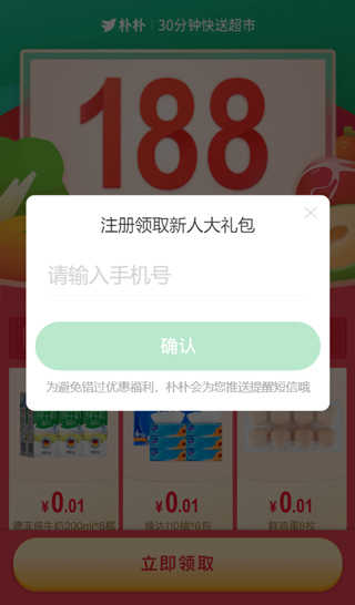3、输入手机号之后即可领取188元新人大礼包,即刻在本站下载朴朴App使用优惠吧!
